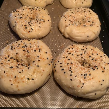 7. Boil the Bagels: In a large pot of water, bring water to a boil. Reduce the heat to a simmer and carefully place a few bagels into the water. Boil them for about 1-2 minutes on each side. Using a slotted spoon, remove the boiled bagels and place them back on the parchment-lined baking sheet.