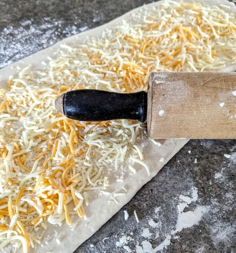- Add Filling: Sprinkle seasonings on dough. Spread the shredded cheese evenly over the dough and then add the pepperoni slices on top.