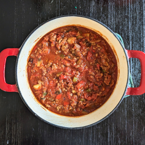 In a Dutch oven or heavy duty pan on medium heat cook onion, garlic, celery, and pepper in 1 tbsp. of olive oil until slightly browned. Add mushrooms and cook 1-2 minutes. Add ground turkey and cook until browned. Strain ingredients and return to pot.